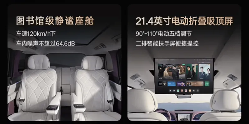 比亚迪仰望 U8L 鼎世版拥有图书馆级静谧座舱,车速 120km/h 下车内噪声不超过 64.6dB;配备 21.4 英寸电动折叠吸顶屏,支持 90°-110° 电动五档调节、二排智能扶手屏便捷操控。